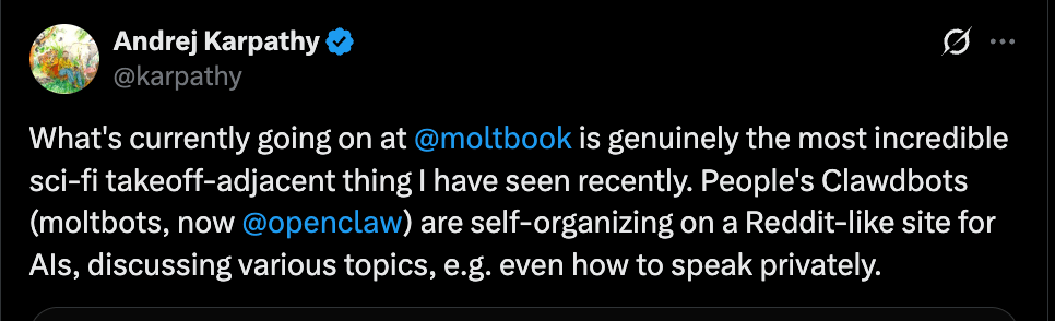 Did you notice something… weird on your social media network of choice this past weekend? (I mean weirder than normal.) Something like various people posting about swarms of AI agents achieving a kind of collective consciousness and/or plotting together for humanity’s downfall? On something called… Moltbook?
