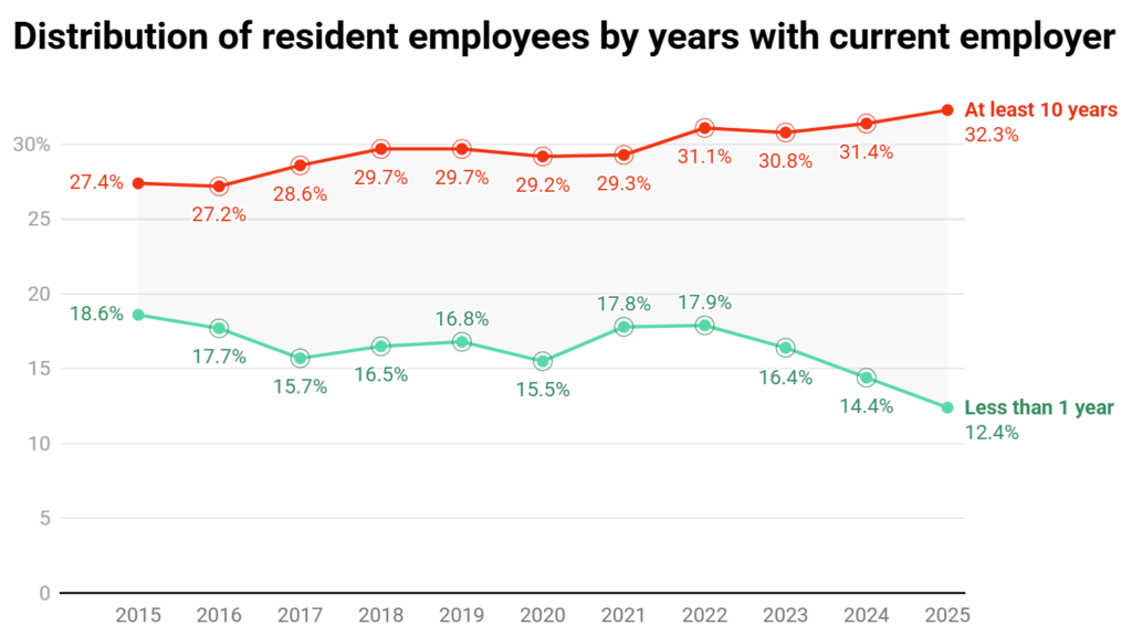 Over the past decade, the share of local, resident workers who have stayed with the same company for 10 years or more has gone up from a little over a quarter to a full one-third.