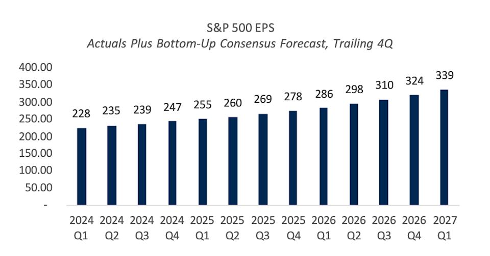 Per a new projection from RBC Capital Markets (see charts below), the S&P 500’s per-share dollar value in the 2026 fourth quarter is expected to be $324. That has improved significantly since the start of the earnings reporting season, when it was at $313.